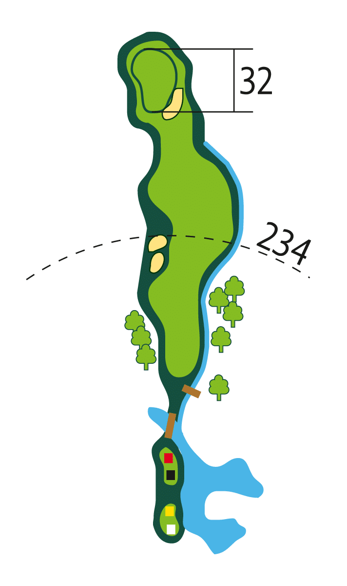 Ein leichtes Eröffnungsloch, das eine Annäherung mit einem mittleren Eisen auf ein schmales Zwei-Terrassen-Grün erfordert.